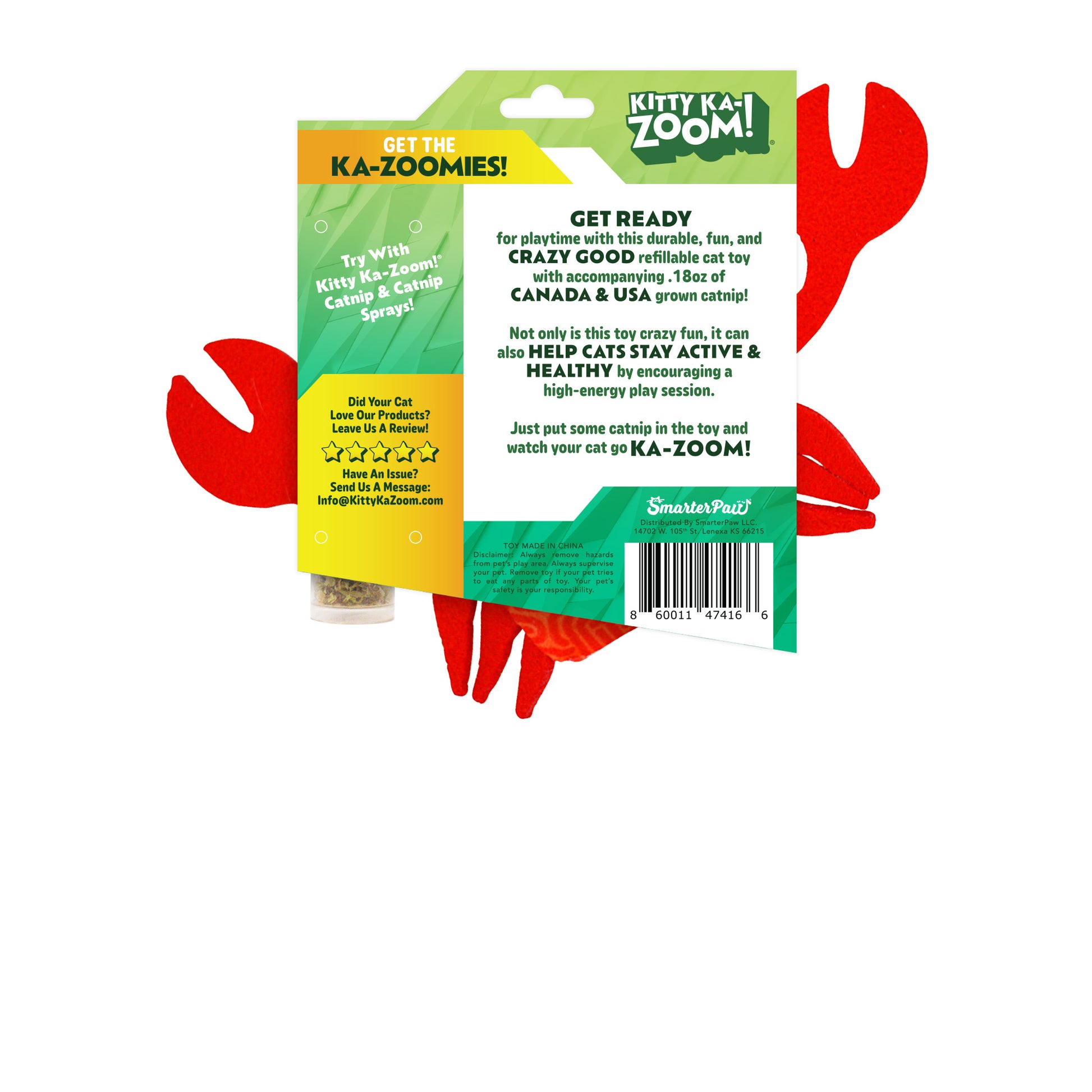 Get ready for playtime with this durable, fun, and CRAZY GOOD crab-tastic refillable Catnip toy with accompanying .18oz(.5g) of Canada & USA grown Catnip! A soft plush body and many felt extremities encourages your pet to wrestle, toss, and chomp. Not only is this toy crazy fun, it can also help cats stay active and happy by encouraging a high-energy play session. Just put some Kitty Ka-Zoom Catnip in the toy and watch your cat go KA-ZOOM!